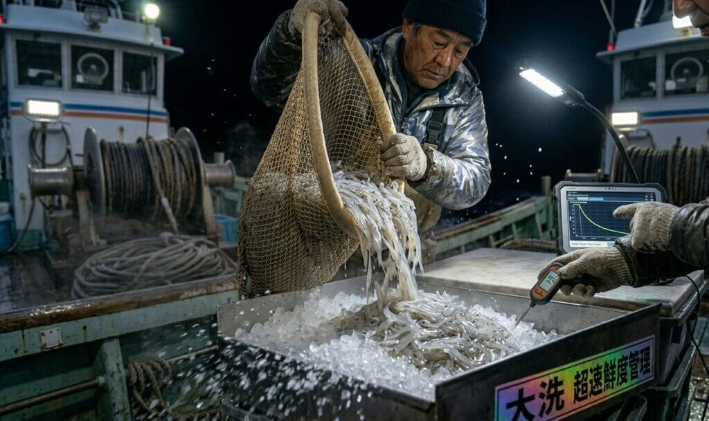 ターゲットは、駿河湾と並び称されるシラスの聖地・鹿島灘の「白いダイヤ」。しかし、シラスは驚くほど繊細な生き物です。水揚げされた瞬間から、自らの熱と外気によって、その透明度と甘みは急速に失われていきます。