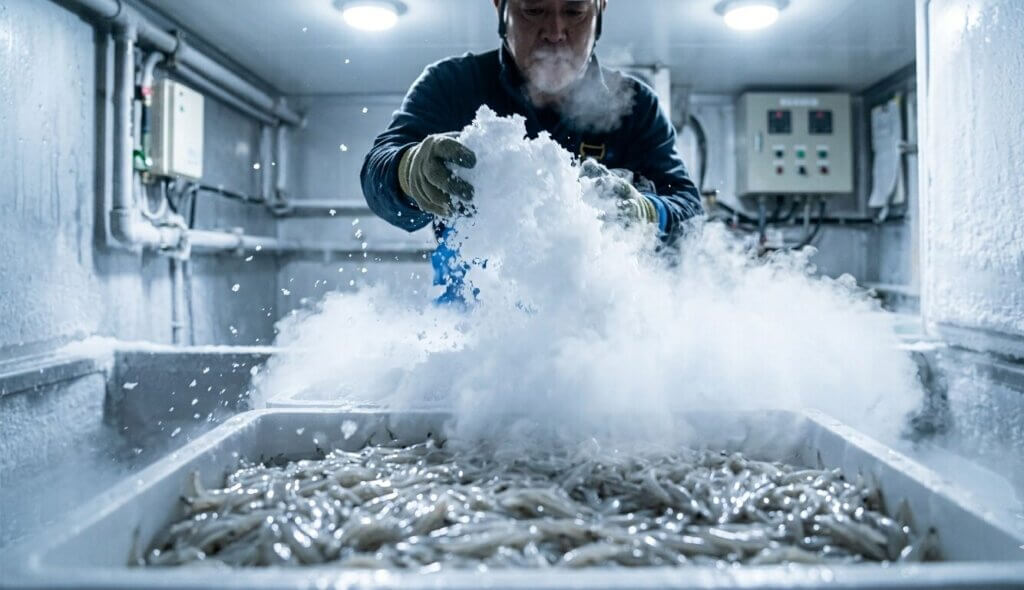 単なる氷水ではありません。彼らが使うのは、シラスの隅々まで瞬時に冷気が行き渡るように、あえて微細に砕かれた「フレークアイス」。そして、シラスが凍り始める寸前の「黄金の温度」を保つための精密な塩分濃度調整。この0.1度単位の管理が、シラスの細胞を「眠らせる」のです。