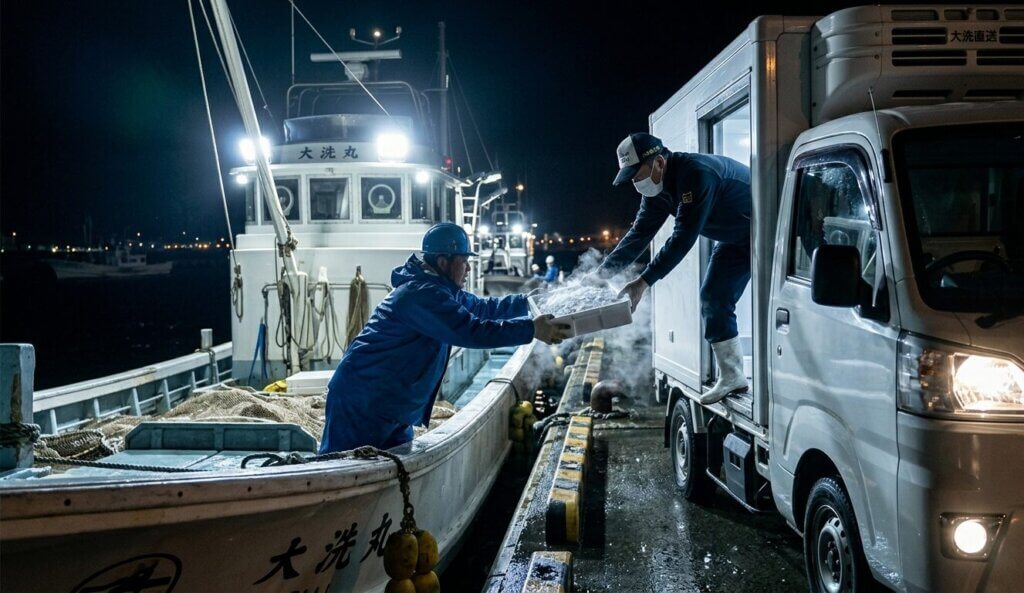茨城県・大洗港。週末には多くの家族連れや観光客で賑わうこの港町には、一般の人が決して目にすることのない「もう一つの顔」があります。それは、深夜2時の暗闇の中で行われる、命がけの「鮮度リレー」です。