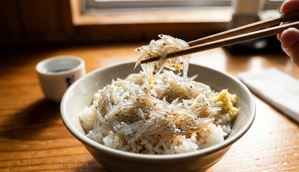 ついに運ばれてきた、宝石のような「生シラス丼」。朝日に照らされ、一匹一匹の黒い目がくっきりと見えるほど透明なその姿は、見る者を圧倒します。