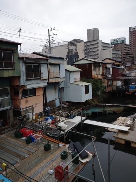 子安駅から海側へ向かうと、幅の狭い運河沿いに木造家屋が密集する一帯に出る。建物は敷地いっぱいに建てられ、場所によっては水面のすぐ上まで張り出している。運河と建物の距離が極端に近く、暮らしと水辺が分かちがたく結びついてきたことが分かる風景だ。