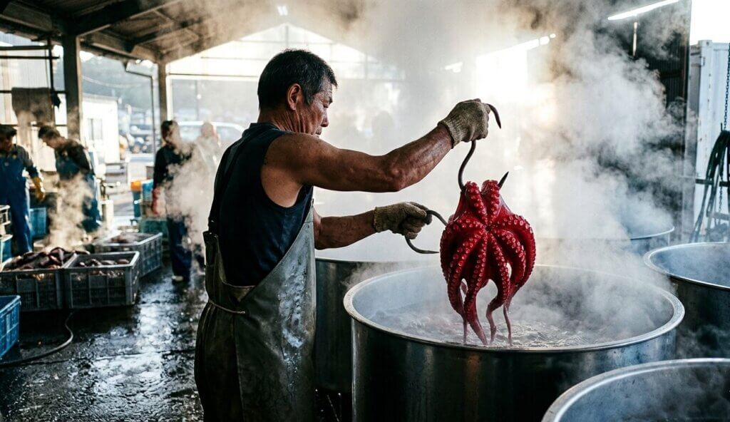 市場を離れ、私たちの手元に届いたタコは、刺身や煮物へと姿を変える。しかし、箸で持ち上げた時の弾力、噛みしめるたびにあふれ出す濃厚な旨味は、あの荒々しい海と、大釜の蒸気の記憶を鮮明に宿している。