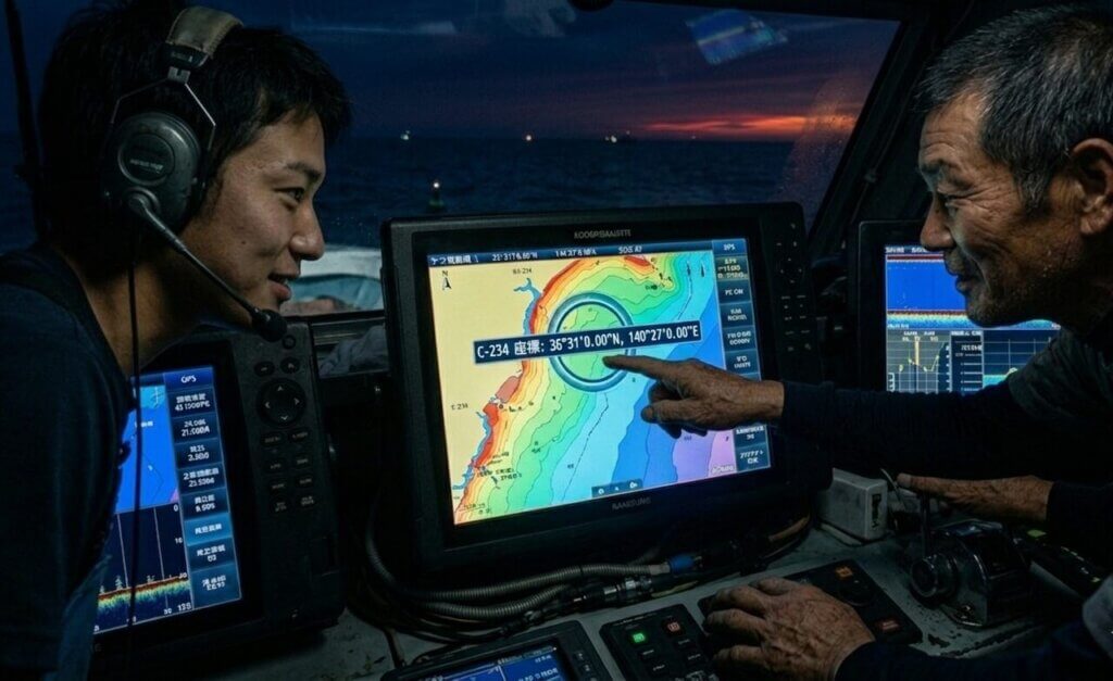 茨城県日立市、久慈浜漁港。深夜の静寂を切り裂いて出港する漁船の目的地は、目に見える島でも岩場でもない。それは、暗闇の中でモニターが指し示す無機質な「座標」だ。