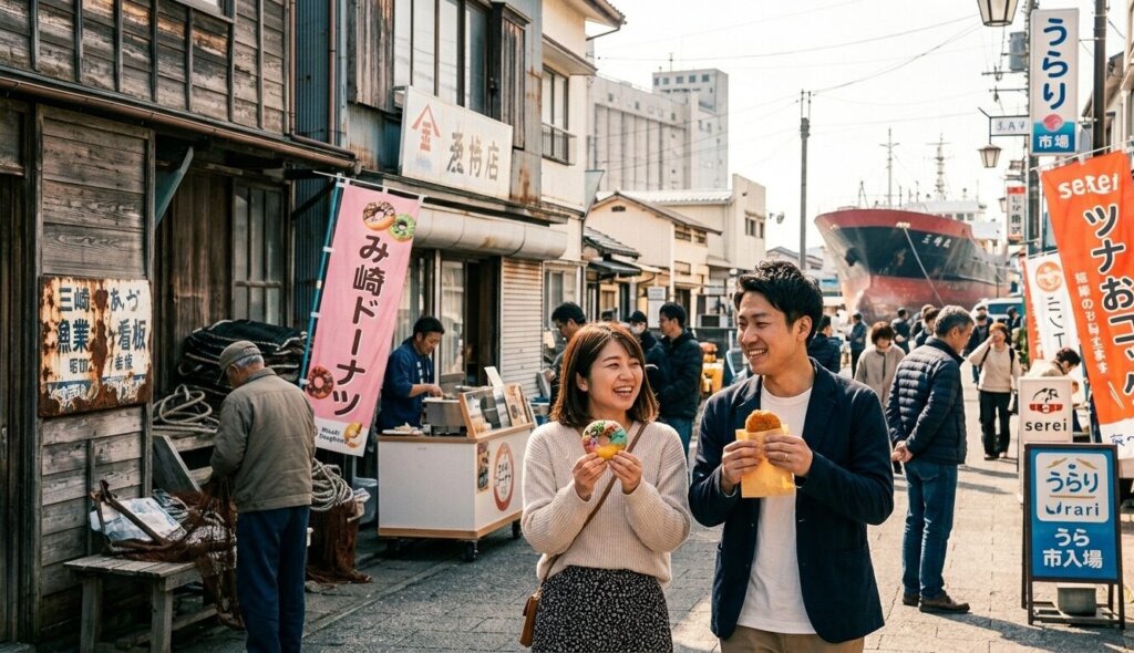 古い木造建築の軒先で、若いカップルが笑顔で食べ歩きを楽しむ光景。そこには、漁師町の無骨な魅力と、現代的な楽しさが溶け合った、新しい三崎の日常が広がっています。