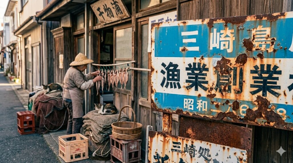 しかし、この「錆」こそが、荒波と戦ってきた三崎の仕事の歴史。この道で生きてきた人々の「絶対に負けない」という商魂は、看板が錆びても、決して色褪せることはありません。この街の強固な土台があるからこそ、新しい「うらり」という希望の場所が生まれたのだと、路地裏の静寂が教えてくれます。
