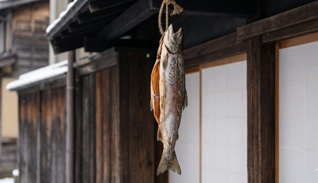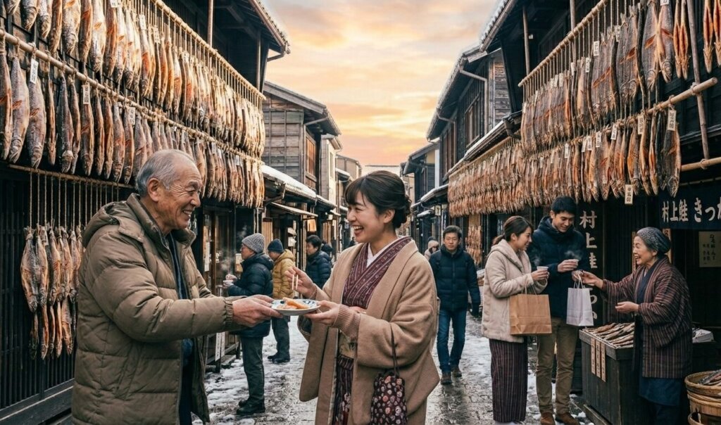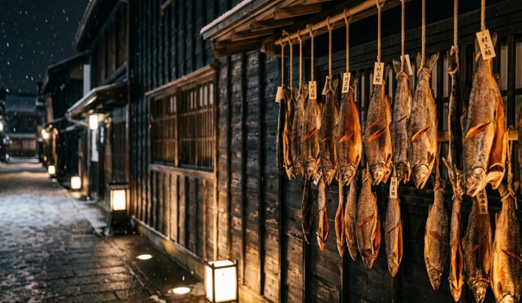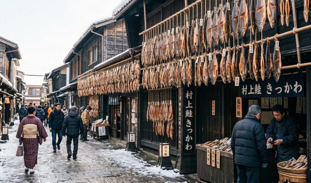 鮭のカーテンの中を潜り抜けるような、少し不思議で圧倒的なこの光景。冷たい海風に吹かれ、ゆっくりと熟成を待つ鮭たちの姿は、どこか神聖で、それでいて暮らしの温もりに満ちています。「干すこと自体が、この街の呼吸なんだ」――そう肌で感じる、村上最大の「写真映え」スポットです。