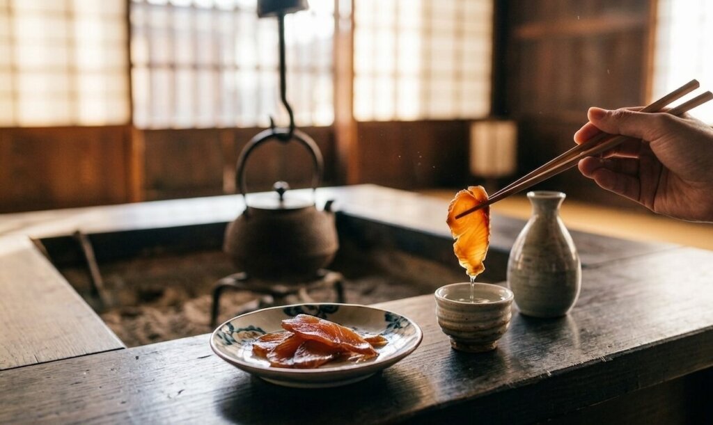 さて、お腹が空いたら老舗の暖簾をくぐりましょう。「捨てるところがない」と言われる村上の鮭料理、まずはこの2つを外せません。鮭の酒びたし: 半年以上かけて干し上げた身を薄切りにし、地酒をさっと振っていただきます。噛むほどに凝縮された旨味が溢れ出し、お酒好きにはたまらない「時の知恵」の結晶で