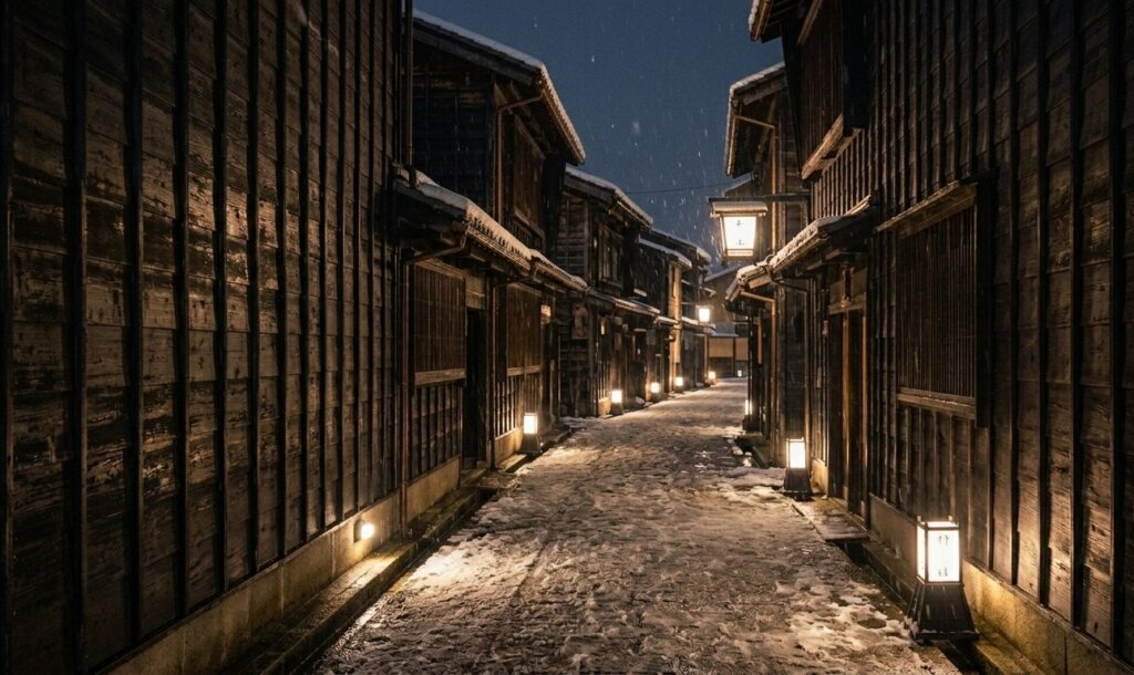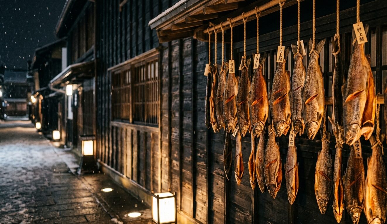 三面川を遡る鮭の音、冷たく張り詰めた冬の空気。 「鮭の魂が宿る街」村上。 1,000匹の鮭が吊るされた圧倒的な日常と、夜の帳に浮かび上がる黒塀の美学。この街で出会った、命を慈しむ「百種の知恵」を綴ります。
