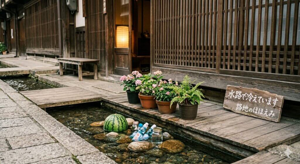 街道の脇を流れる澄んだ水路。そこには、野菜が冷やされていたり、住人が植えた季節の花が揺れていたりと、思わず笑みがこぼれるような「人間味」が溢れています。