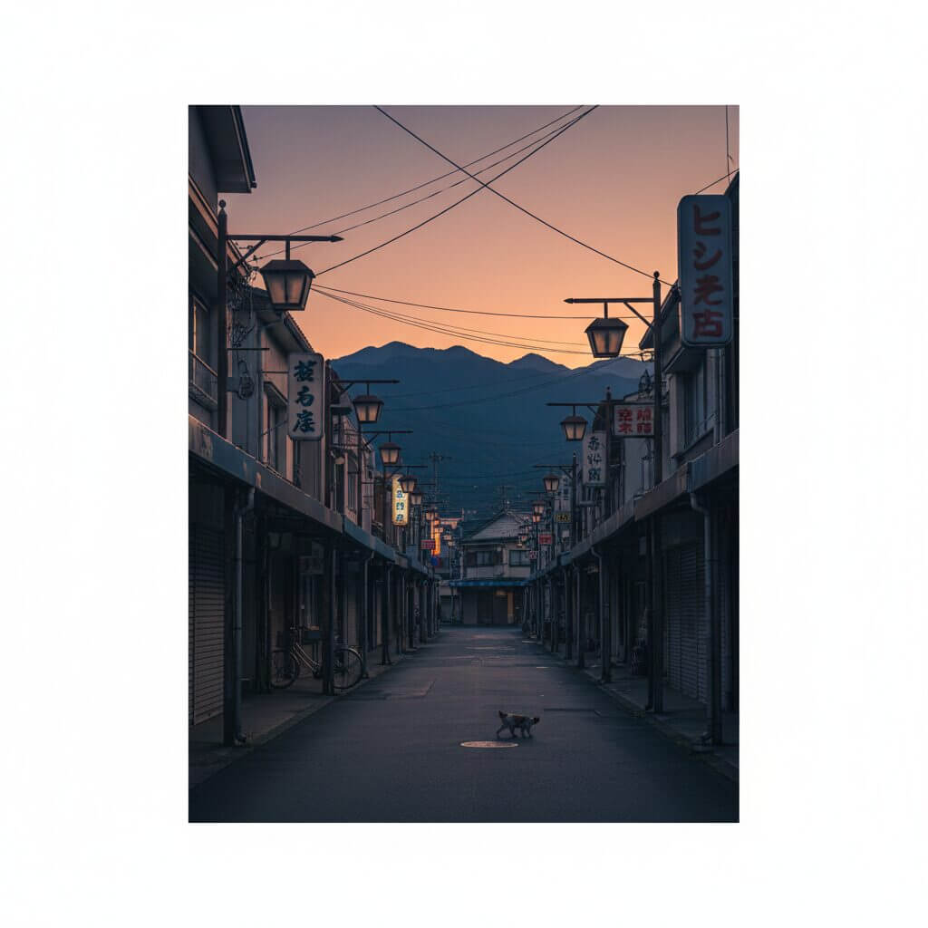 少し色あせた看板、シャッターが半分閉まった店、静かに続く一本道。
