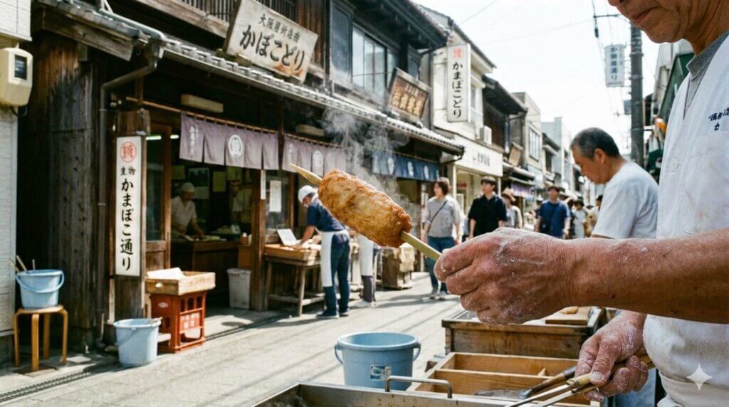 かまぼこ通りで印象に残るのは、**揚げたてのかまぼこが生まれる「途中の瞬間」**を、通りから自然に見られることです。