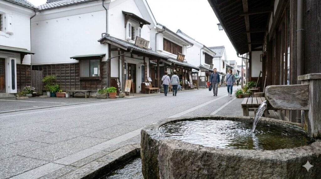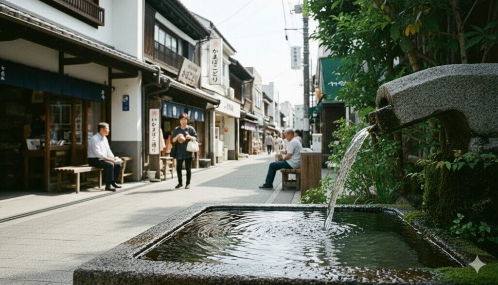 商店街の中に「使われる水」があることで、通り全体の空気もどこか落ち着いて感じられます。
