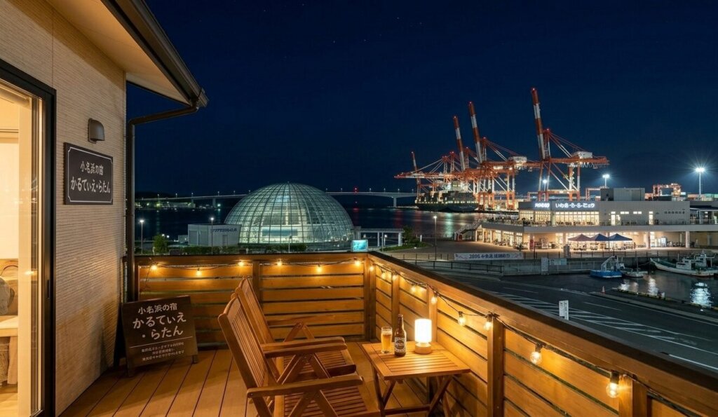 リニューアルされた港の宿やゲストハウスの静かな夜。