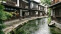 解説: 商店街の古い木造建築の隙間から、ふと桂川の深淵が覗く。日常のすぐ裏側に潜む「川による支配」を感じさせるリアルな街角。