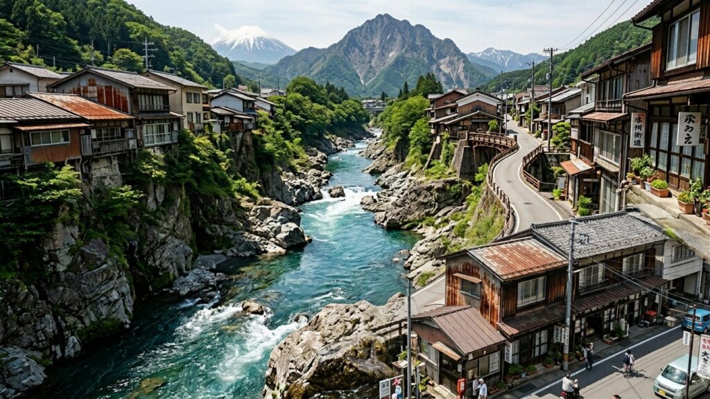 都留の穏やかな家中川とは一変、大月の桂川は「街の動脈」そのものです。駅前商店街のすぐ裏手には、深いV字谷が貫き、商店や宿の土台を洗うように蛇行する青白い激流が咆哮を上げています。この自然の脈動と、崖っぷちに建つ古い宿場の家々。錆びたトタン屋根の質感こそが、甲州街道の要衝として栄えた大月の、時間の積み重なりを象徴しています。