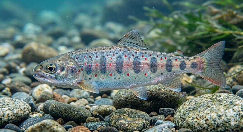 解説: 一切の濁りがない清冽な水の中で静かに定位する、気高きアマゴ。銀白色の魚体に並ぶ、青みがかった楕円形の斑点(パーマーク)のみを写し出した自然の結晶。