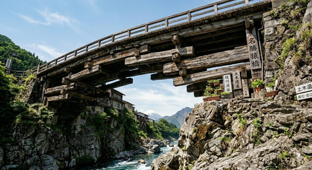 解説: 橋脚を立てることを拒む激流に対し、木をせり出させて空中で繋いだ「刎橋(はねばし)」。人間の知恵と地形が真っ向から勝負している無骨な姿。