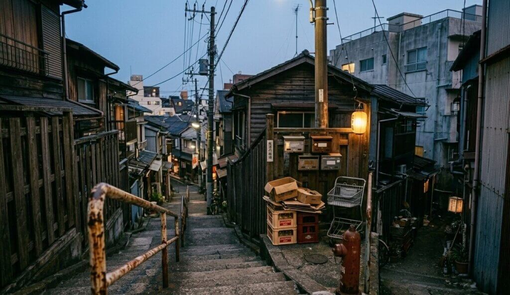 近代的な地下鉄の出口から数歩歩けば、そこには昭和に取り残されたような、逃げ場のない狭い路地が口を開けている。利便性を追求した都市開発のすぐ背中合わせに、あえてその流れに逆らうかのように、使い込まれたバケツや錆びた自転車が放置されている。