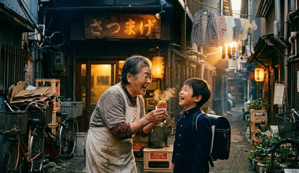 古びた惣菜屋の勝手口。夕闇が迫る中、使い込まれたエプロンを締めた老婆が、学校帰りの小学生に揚げたてのさつま揚げを差し出していた。「今日も元気だね」という、何千回繰り返されたであろう日常の挨拶。それを受け取る子供の、計算も演出もない爆発的な笑顔。