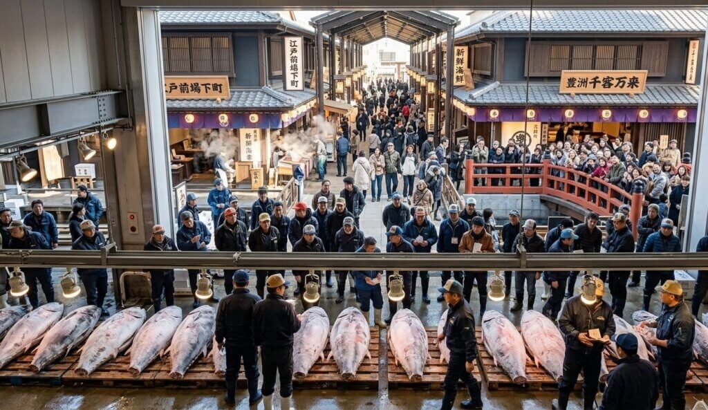 早朝、見学者デッキからは、あの有名なマグロのセリを眼下に望むことができる。整然と並んだ巨大なマグロと、鐘の音と共に始まる競り人の独特な掛け声。ガラス越しではあるが、一匹の魚に人生を賭ける男たちの視線は、築地時代から変わらぬ鋭さを持っている。