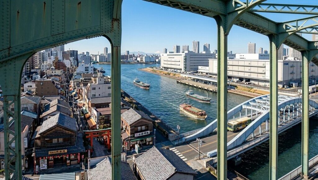築地へ向かう屋形船や、豊洲へ向かうタグボート。勝鬨橋の下をくぐり抜ける水の流れは、かつて築地へ荷を運んだ時代と寸分違わず繋がっている。橋の上に立ち、上流の築地と下流の豊洲を交互に眺めれば、東京という都市の「代謝」の歴史が俯瞰できるはずだ。