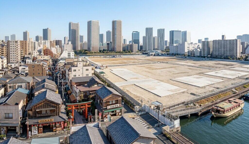 かつての扇形の巨大な建物はもうない。しかし、その広大な空白地帯に立つと、ここがいかに東京の物流の中心であったかが肌で理解できる。跡地を横目に歩けば、隅田川の川面がキラキラと光り、再開発を待つ街の静かな息吹を感じることができるだろう。