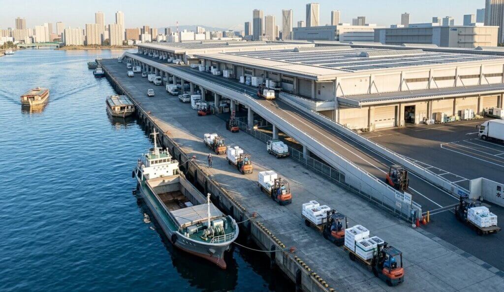 豊洲市場を訪れてまず驚かされるのは、その圧倒的な機能美だ。築地時代には手狭だった荷受け場は、ここでは広大な運河に面した「水上桟橋」として設計されている。
