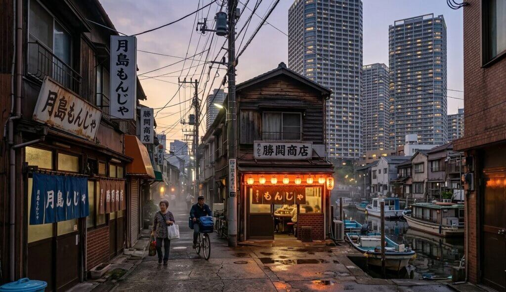 勝鬨や月島に一歩足を踏み入れれば、そこには下町の路地裏が今も残る。夕暮れ時、タワーマンションの影が伸びる路地から、もんじゃ焼きの匂いや夕飯の支度の音が聞こえてくる。市場という「非日常」のすぐ隣にある、この「日常」のコントラストこそが、湾岸エリアの魅力だ。