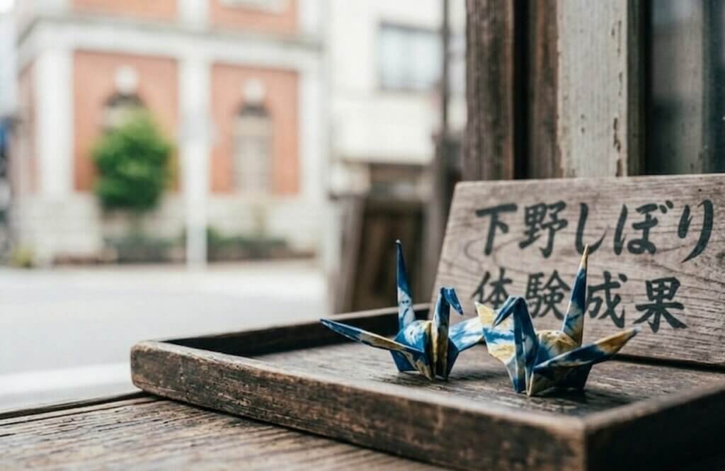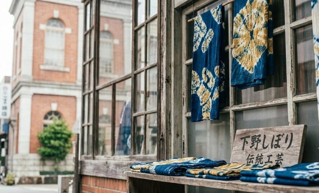 食: 「あ、あのレンガ造りの建物の窓辺!鮮やかな色が見えるよ。あれが伝統工芸の『下野しぼり』?」