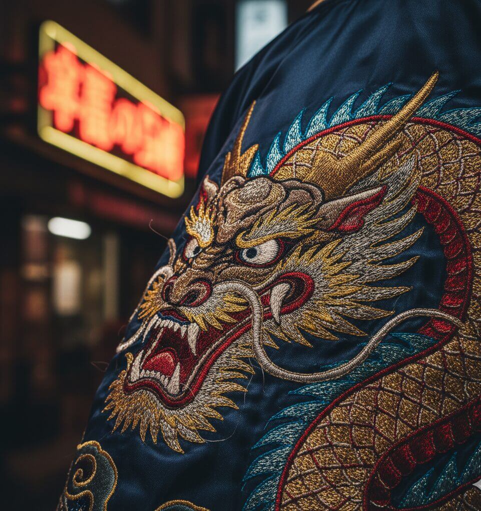 商店街を歩いていると、ひと際目を引くのが、光沢のあるサテン生地に鮮やかな刺繍が施された「スカジャン」です。その発祥はこの横須賀。戦後、駐留していた兵士たちが、自分のジャケットに日本らしい刺繍を入れて持ち帰った「スーベニア(お土産)ジャケット」が始まりです。